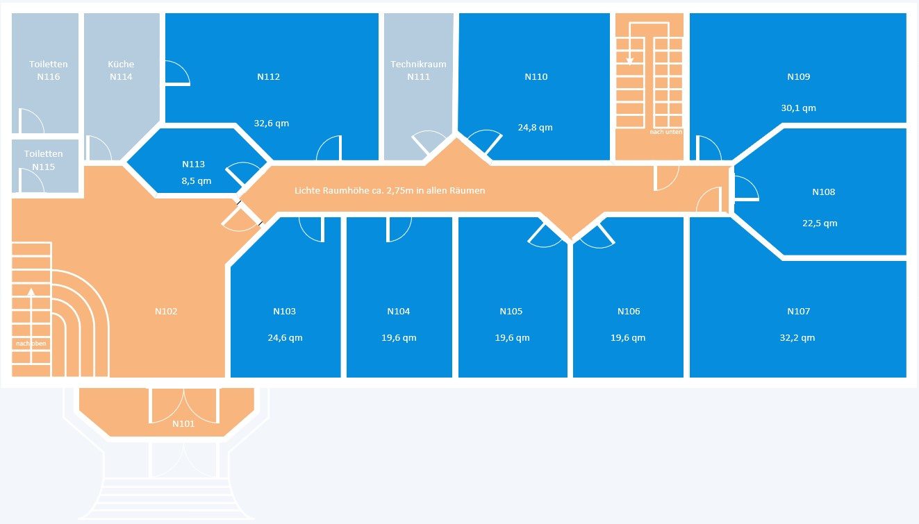 Alle Räume sind mit stuhlrollengeeigneten Teppichböden ausgelegt und haben Kabelkanäle für zusätzliche individuelle Infrastruktur sowie bildschirmgerechte Deckenbeleuchtung. Einige Räume haben einen eigenen Wasseranschluss. Auf Wunsch kann das Büro möbliert werden.