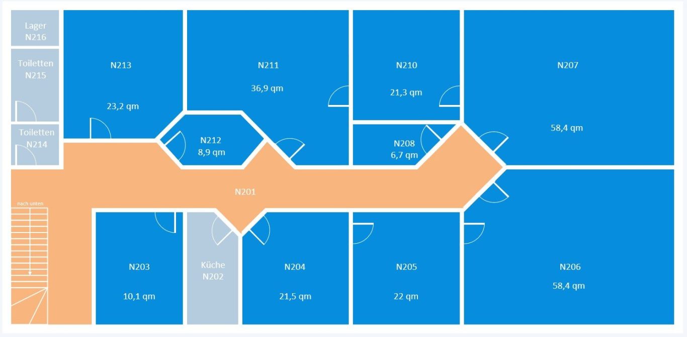 Im renovierten Bürogebäude der Königshainer Straße 5 stehen auf zwei Etagen Räumlichkeiten zwischen 10 bis 100m² zur Verfügung.
